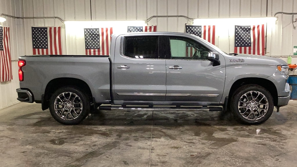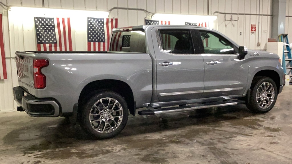 Sterling Gray Metallic 2025 4D Crew Cab Chevrolet Silverado 1500 High Country 4WD 10-Speed Automatic EcoTec3 5.3L V8 10-Speed Automatic, 4WD, Jet Black Leather, 10-Way Power Driver Seat w/Lumbar, 10-Way Power Passenger Seat Adjuster w/Lumbar, 12.3" Multicolor Reconfigurable Digital Display, 120-Volt Bed Mounted Power Outlet, 120-Volt Interior Power Outlet, 15" Diagonal Multicolor Head-Up Display, 170 Amp Alternator, 2 USB Data Ports, 2nd Row Heated Outboard Seats, 3.23 Rear Axle Ratio, 4-Wheel Disc Brakes, 7 Speakers, ABS brakes, Adaptive Cruise Control, Air Conditioning, All-Weather Floor Liner (LPO), Alloy wheels, AM/FM radio: SiriusXM with 360L, Apple CarPlay/Android Auto, Auto High-beam Headlights, Auto-dimming door mirrors, Auto-Dimming Inside Rear-View Mirror, Auto-dimming Rear-View mirror, Auto-Locking Rear Differential, Automatic temperature control, Bed View Camera, Bluetooth® For Phone, Body-Color Painted Mirror Caps, Bodyside moldings, Brake assist, Bumpers: body-color, Chevytec Spray-On Black Bedliner, Chrome Assist Steps, Chrome Recovery Hooks, Color-Keyed Carpeting Floor Covering, Compass, Deep-Tinted Glass, Delay-off headlights, Driver door bin, Driver Memory, Driver vanity mirror, Dual Exhaust w/Polished Outlets, Dual front impact airbags, Dual front side impact airbags, Dual Rear USB Ports (Charge Only), Electric Rear-Window Defogger, Electronic Stability Control, Electronic Transmission Range Selector Shifter, Emergency communication system: OnStar, Enhanced Automatic Emergency Braking, Floor Mounted Center Console, Following Distance Indicator, Forward Collision Alert, Front anti-roll bar, Front Black Bowtie Emblem (LPO), Front Bucket Seats, Front Carpeted Floor Mats, Front Center Armrest, Front dual zone A/C, Front fog lights, Front LED Fog Lamps, Front License Plate Kit, Front Pedestrian Braking, Front Rain-Sensing Wipers, Front reading lights, Front wheel independent suspension, Fully automatic headlights, Garage door transmitter, Genuine wood console insert, Genuine wood dashboard insert, Genuine wood door panel insert, HD Surround Vision, Heated door mirrors, Heated Driver & Front Outboard Passenger Seats, Heated front seats, Heated rear seats, Heated Steering Wheel, Heated steering wheel, High Capacity Suspension Package, High Country Premium Package, Hitch Guidance, Hitch Guidance w/Hitch View, Illuminated entry, In-Vehicle Trailering System App, Integrated Trailer Brake Controller, IntelliBeam Automatic High Beam On/Off, Keyless Open & Start, Lane Keep Assist w/Lane Departure Warning, LED Cargo Area Lighting, Low tire pressure warning, Memory seat, Molded Black Splash Guards (LPO), Occupant sensing airbag, OnStar Services Capable, Outside Heated Power-Adjustable Mirrors, Outside temperature display, Overhead airbag, Overhead console, Panic alarm, Passenger door bin, Passenger vanity mirror, Perforated Leather Seat Trim, Perimeter Lighting, Power door mirrors, Power driver seat, Power Front Passenger Windows w/Express Up/Down, Power Front Windows w/Driver Express Up/Down, Power passenger seat, Power Rear Windows w/Express Down, Power Sliding Rear Window w/Rear Defogger, Power steering, Power Sunroof, Power Tailgate, Power Tilt & Telescoping Steering Column, Power windows, Preferred Equipment Group 3LZ, Premium audio system: Chevrolet Infotainment 3 Premium, Premium Bose 7-Speaker Sound System, Radio data system, Radio: Chevrolet Infotainment 3 Premium System, Rain sensing wipers, Rear Camera Mirror, Rear Carpeted Floor Mats, Rear Cross Traffic Braking, Rear Pedestrian Alert, Rear reading lights, Rear seat center armrest, Rear step bumper, Rear Wheelhouse Liners, Rear window defroster, Remote keyless entry, Remote Vehicle Starter System, Safety Alert Seat, Security system, SiriusXM w/360L Trial Subscription, Speed control, Speed-sensing steering, Split folding rear seat, Standard Tailgate, Steering Wheel Audio Controls, Steering wheel mounted audio cont
